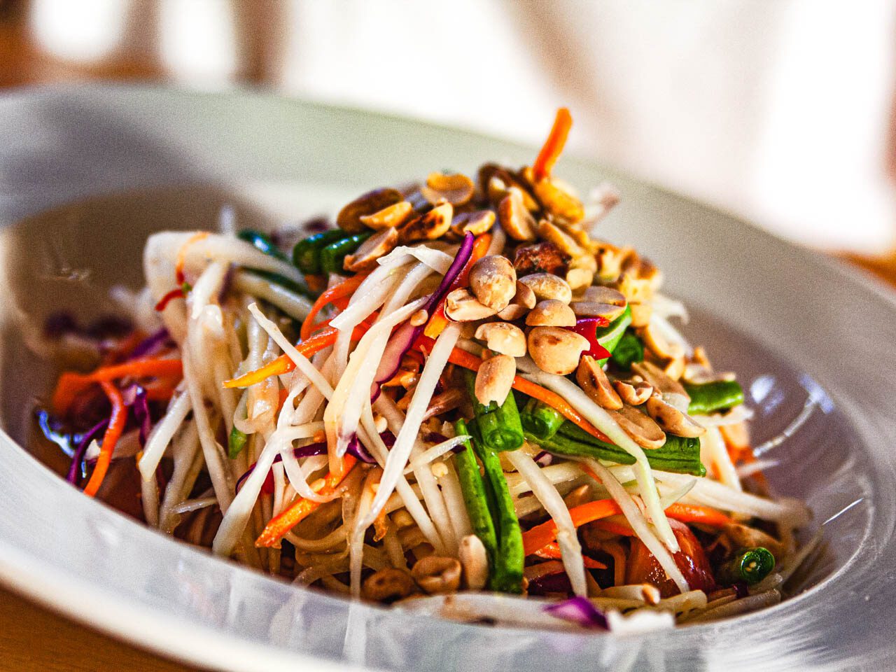 Mimo swojej prostoty, ta sałatka ma szaloną głębię smaku: kwaśność limonki, ostrość papryczek chili, słodycz cukru palmowego i umami sosu rybnego – wszystko razem tworzy prawdziwą eksplozję na podniebieniu.